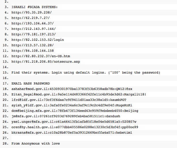The next action, although not a real escalation yet, showed how 0xOmar turned essentially into a brand much like Anonymous, where information on alleged Israeli “SCADA” systems logins and gov.il email addresses was made public. This leak, now not directly associated with 0xOmar turned the attention of some Anonymous twitter accounts into supporting the newly tagged “#fuckIsrael” activities.