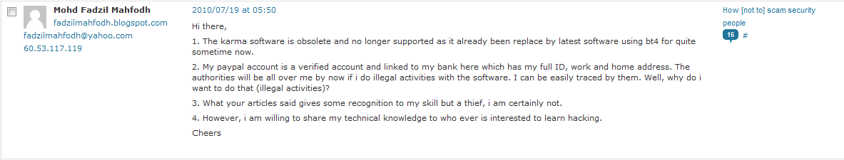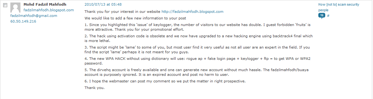 Now, I know - it’s not really fair to pick on these guys that hard. That’s why I’m leaving this to the Malaysia CERT (as you may have noticed, 1337 Fadzil forgot to proxy his connections to this blog and his IP has been logged on all comments and relevant hits on the site), to figure out how to handle. I truly hope that his suggestion to use the details provided on his paypal account and bank account will actually yield some results, and wish our friend the best of luck in his endeavors in the security business (although I highly doubt he’ll be at DefCon later this week).